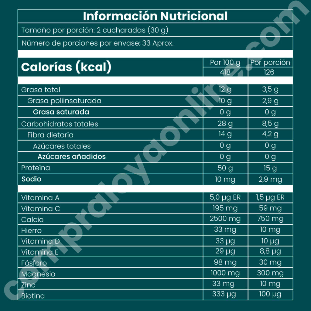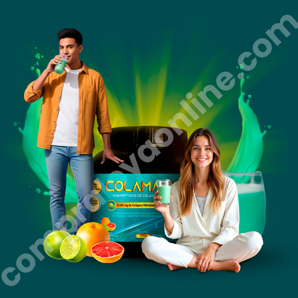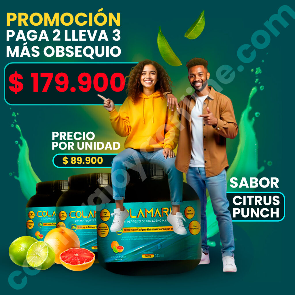 Harina de coco, péptidos de colágeno, colágeno hidrolizado marino, cúrcuma en polvo (Cúrcuma longa), fosfato tribásico de calcio (fuente de calcio), citrato de magnesio (fuente de magnesio), omega 3 en polvo (fuente de DHA), fructooligosacáridos (fibra prebiótica), sabor a citrus punch (saborizante artificial), bisglicinato de magnesio (fuente de magnesio), cloruro de magnesio (fuente de magnesio), glicina, lisina, prolina, sulfato de zinc heptahidratado (fuente de zinc), vitamina C (ácido ascórbico), vitamina E, biotina, vitamina K, vitamina D.