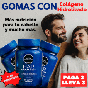 las gomas de colágeno Har Booxter nutren, refuerza y alimentan tu cabello,Piel y en general a todo tu cuerpo. De igual manera estas Gomitas masticables sabor a mora azul, contienen además del Colágeno hidrolizado, Biotina, vitamina A, vitamina C, vitamina E, vitamina D, vitamina B1, vitamina B2, vitamina B6, vitamina B12, ácido fólico, hierro, zinc y potasio que son de gran aporte nutricional a tu cuerpo nutriéndolo de adentro hacia afeura.